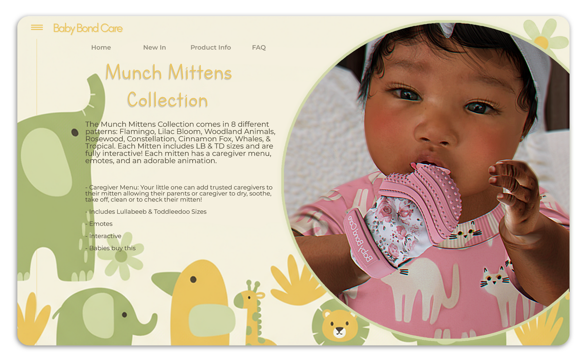 Baby Bond Care: Munch Mittens CollectionThe Munch Mittens collections come in 8 different patterns: flamingo, lilac bloom, woodland animals, rosewood, constellations, cinnamon fox, whales & tropical. Each Mitten includes LB & TD sizes and are fully interactive! Each mitten has a caregiver menu, emotes, and an adorable animation.. Caregiver Menu: your little one can add trusted caregivers to their mitten allowing their parents or caregiver to dry, soothe, take off, clean or to check their mitten!. Includes Lullabeebs & Toddleedoo Sizes