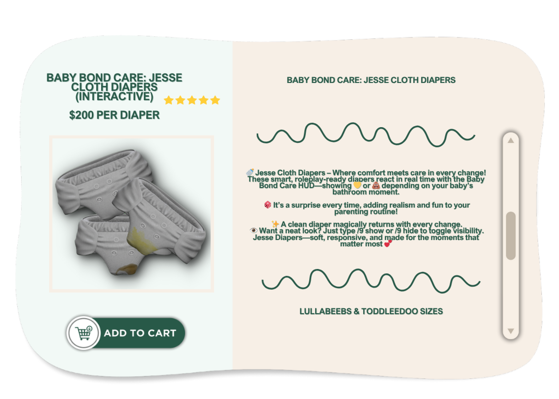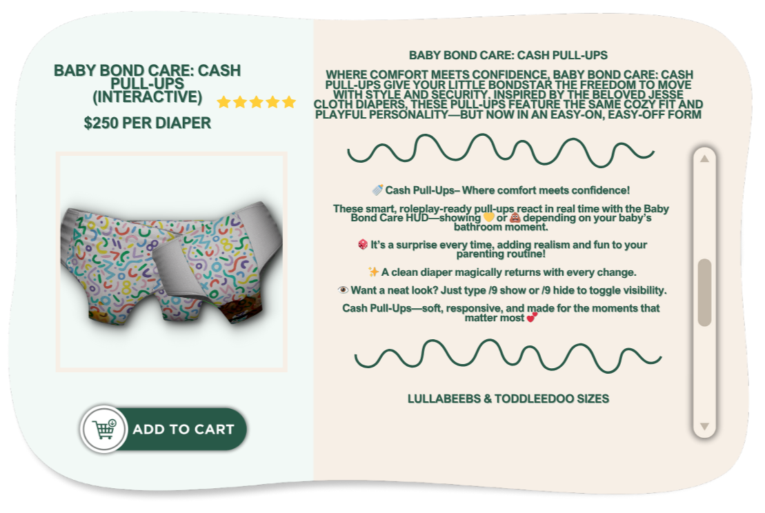 These smart, roleplay-ready pull-ups react in real time with the Baby Bond Care HUDโshowing ๐ or ๐ฉ depending on your babyโs bathroom moment.