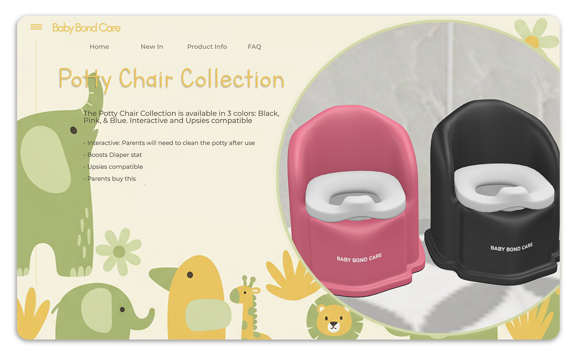The Potty Chair Collection is available in 3 colors: Black, Pink, & Blue. Interactive and Upsies compatible